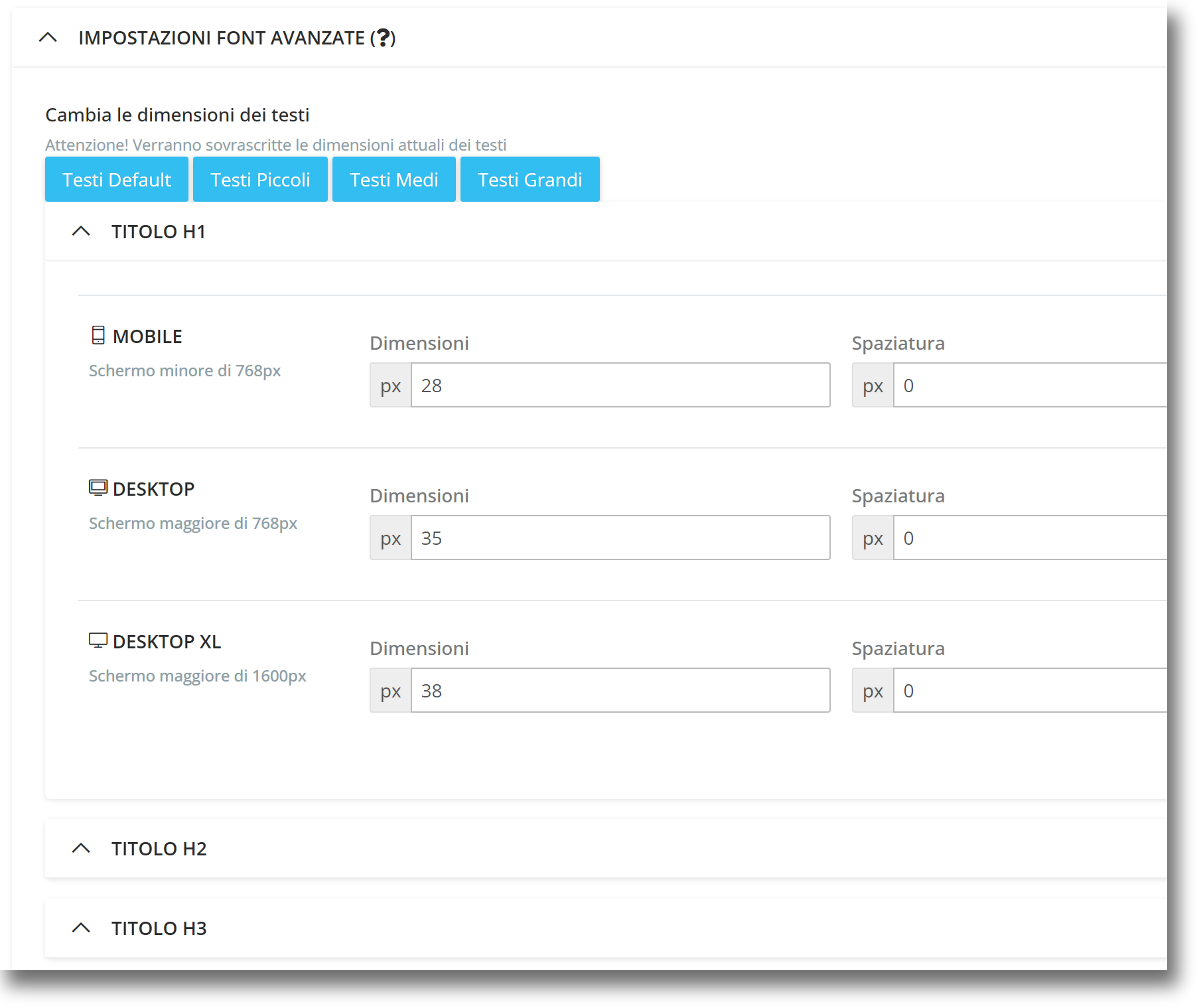 Adatta le dimensioni dei tuoi titoli e testi, l'interlinea e la spaziatura per diversi dispositivi. Personalizza H1, H2, H3, testo, ecc. per mobile, desktop e desktop XL direttamente dalle impostazioni del tuo sito Shopme. Vai a personalizzarli ora in Impostazioni → Impostazioni Sito → Layout!