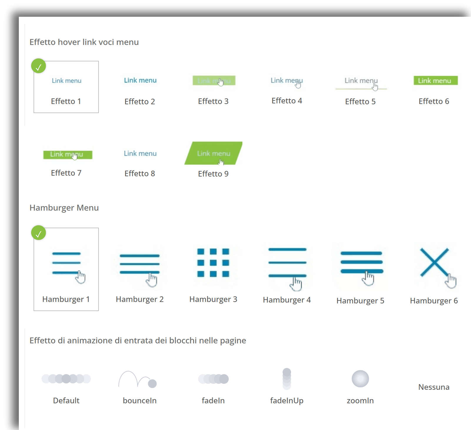 Rendi il tuo sito web più interattivo e dinamico con le nuove opzioni di personalizzazione delle animazioni per l'hover del menu, dell'hamburger menu e per l'entrata dei blocchi in pagina. Scopri tutte le opzioni disponibili in Impostazioni → Impostazioni Sito → Layout!